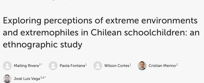 En el contexto del proyecto NEXER en alianza con la Universidad de Antofagasta se presentan los resultados del presente proyecto. El trabajo titulado: "Exploring perceptions of extreme environments and extremophiles in Chilean schoolchildren: an ethnographic study", busca dar cuenta de las representaciones que tienen escolares que viven en zonas extremas del país sobre microorganismos específicos.